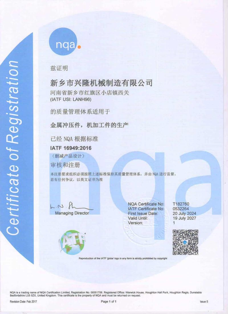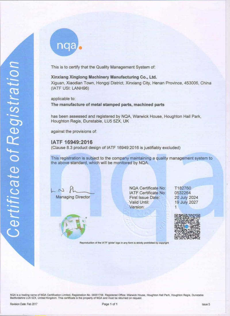 公司簡介新鄉(xiāng)市興隆機械制造有限公司成立于2004年,是一家專門生產濾清器配件、電池配件、冰箱配件等金屬沖壓件的機加工企業(yè)。公司位于新鄉(xiāng)市紅旗區(qū)小店鎮(zhèn),緊鄰京珠高速、107國道,占地23000m2,于2004年通過了質量管理體系認證。